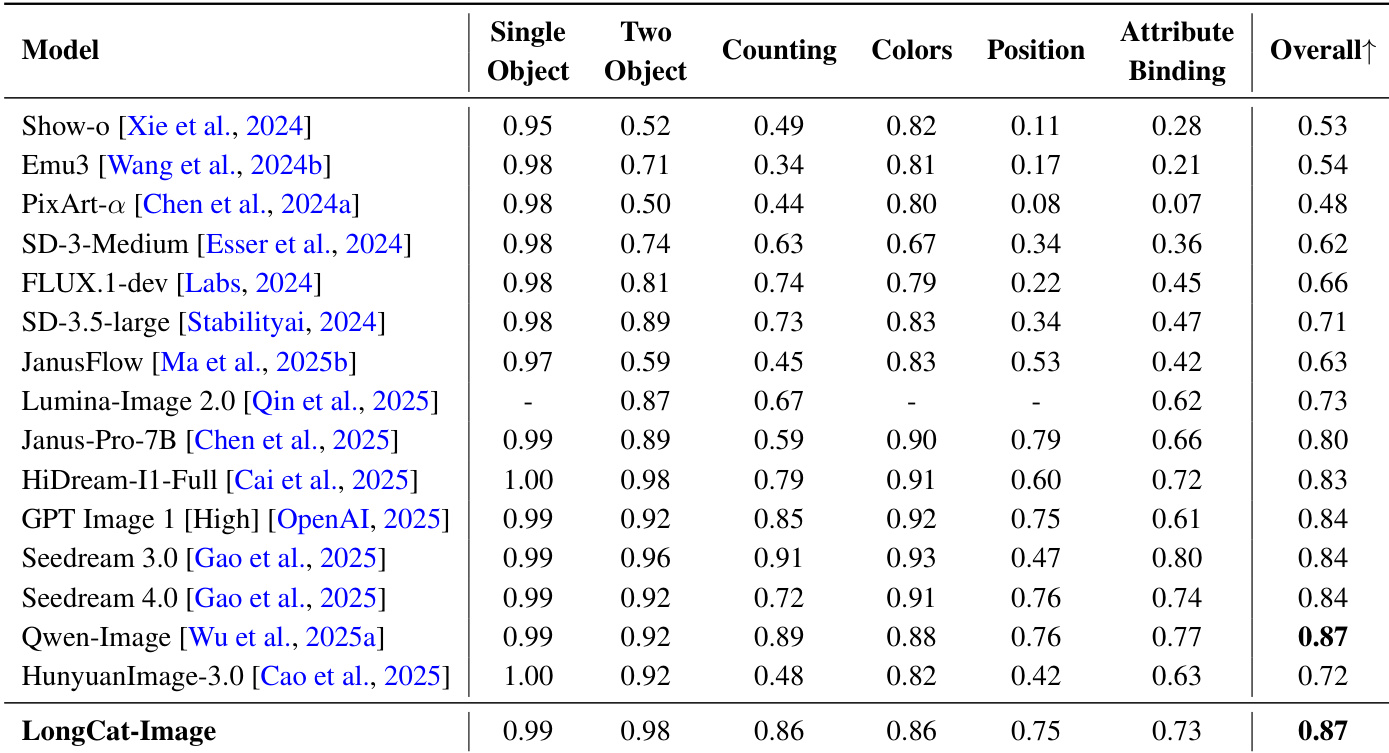 Results show that LongCat-Image achieves an overall score of 0.87 on the GenEval benchmark, matching the best-performing model Qwen-Image and outperforming all other models listed. The model demonstrates strong capabilities in attribute binding, counting, and position understanding, with particularly high scores in single-object and two-object tasks, indicating robust fine-grained control over compositional elements.