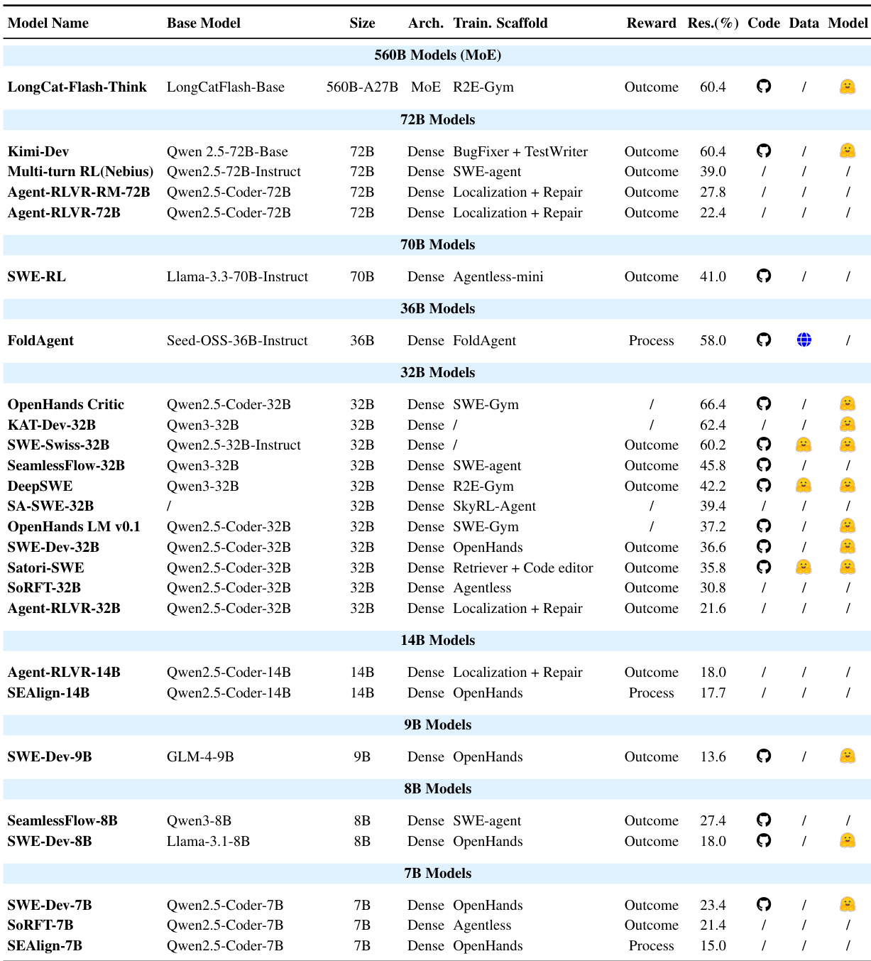 The authors use a table to compare various models trained for issue resolution, categorizing them by size and training method. Results show that smaller models like 32B and 7B can achieve competitive performance when optimized with domain-specific rewards, particularly when using dense feedback signals such as process rewards, which help stabilize training for complex tasks.