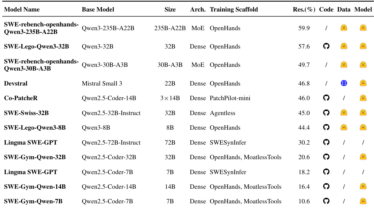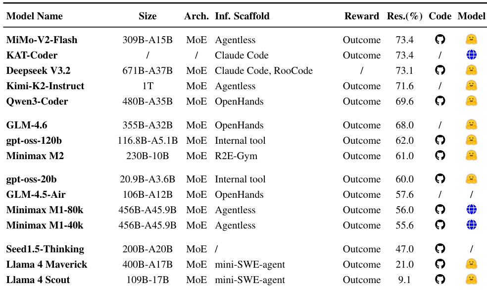 The authors use a table to compare SFT-based models for issue resolution, categorizing them by architecture, inference scaffold, and reward type. Results show that models using outcome-based rewards and specialized scaffolds achieve higher resolution rates, with MiMo-V2-Flash and KAT-Coder leading at 73.4%, while models relying on general-purpose scaffolds or lacking structured rewards perform significantly worse.