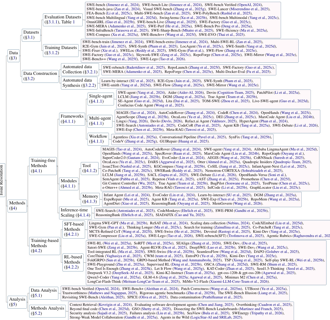 The authors leverage the rise of large language models to tackle issue resolution in software engineering—a complex, repository-level task that goes beyond function generation and demands environment interaction, tool use, and multi-step reasoning. Prior work, largely focused on code completion or isolated generation, fails to address the dynamic, collaborative, and maintenance-heavy nature of real-world development, as exposed by benchmarks like SWE-bench. Their main contribution is a systematic survey of 175 papers that organizes the field into three pillars: data construction, agent frameworks (single/multi-agent, workflow-based), and empirical analysis—while identifying key gaps in efficiency, safety, multimodal reasoning, and evaluation rigor, and providing an open-source repository to track progress.
