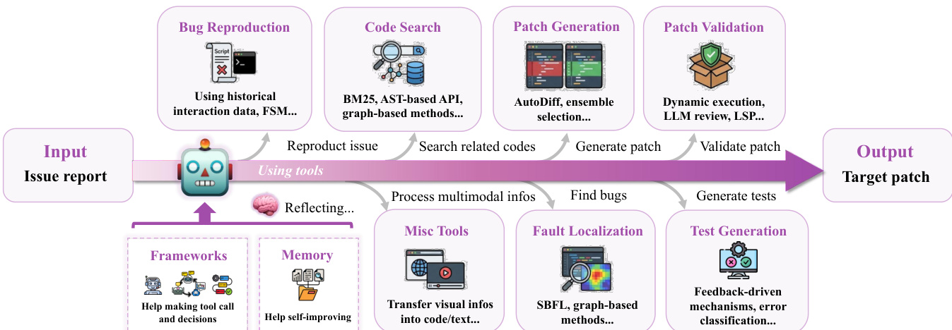 provides a detailed breakdown of the tool modules. These tools are organized according to the standard repair pipeline, starting with bug reproduction, which automates the generation of executable scripts to trigger defects. This is followed by fault localization, where methods like Spectrum-Based Fault Localization (SBFL) and graph-based techniques are used to identify suspicious code regions. Code search tools then retrieve relevant context, employing strategies such as interactive retrieval, graph-based understanding, and dynamic management. Patch generation tools enhance output quality through structured methodologies, including specification inference and robust editing formats. Patch validation tools confirm correctness via dynamic execution or static analysis, while test generation tools create reproduction test cases to validate the resolution.