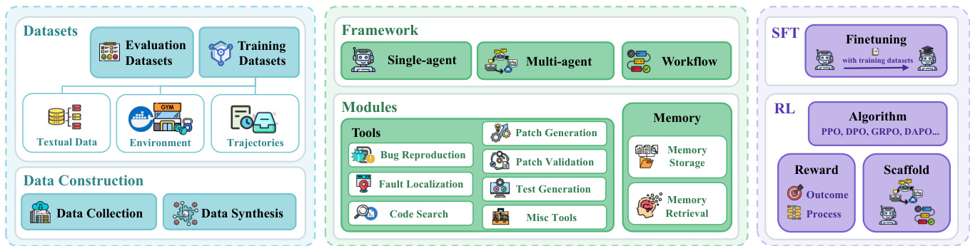 as a finetuning step that uses training datasets. RL-based methods optimize issue resolution strategies through iterative interaction, relying on three core components: the algorithm for policy updates, reward design for guiding exploration, and the scaffold for managing environment rollouts. The algorithm component includes methods like Group Relative Policy Optimization (GRPO), Proximal Policy Optimization (PPO), and Direct Preference Optimization (DPO). Reward design incorporates both sparse outcome-based rewards and dense process-oriented signals to provide feedback throughout the reasoning process. The scaffold serves as the inference framework for rollouts, with OpenHands being the most prevalent choice.