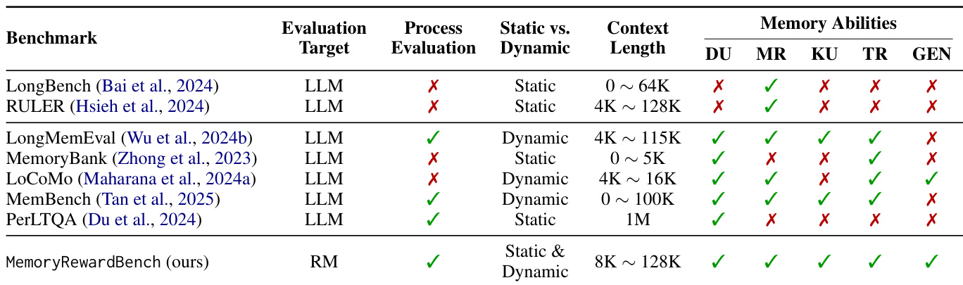 - MemRewardBench is the first benchmark designed to evaluate how well reward models (RMs) can assess long-term memory management in LLMs, covering 10 diverse settings across comprehension and generation tasks with context lengths from 8K to 128K tokens.