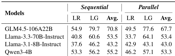Results show that the Sequential memory management pattern consistently outperforms the Parallel pattern across all tasks, with the Sequential pattern achieving higher accuracy in Long-context Understanding, Multi-turn Dialogue, and Long-form Generation. The average performance across all models is significantly better under the Sequential pattern, indicating a strong preference for step-by-step reasoning processes in current reward models.