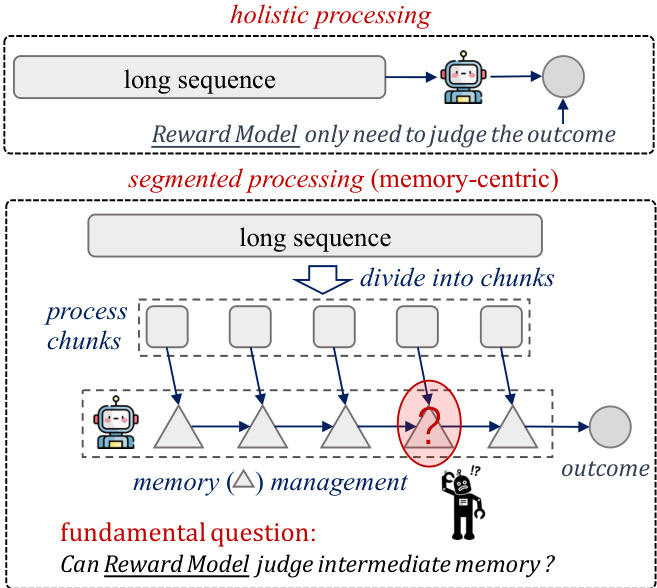 The authors leverage a memory management framework designed to process long sequences by decomposing them into manageable chunks, with the core mechanism governed by two fundamental patterns: sequential and parallel processing. As shown in the figure below, the overall approach begins with a long sequence that is segmented into smaller chunks, which are then processed through a memory-centric mechanism to produce a final outcome. The framework distinguishes between holistic processing, where the entire sequence is treated as a single unit, and segmented processing, where the sequence is divided and processed in parts, raising the central question of whether the reward model can effectively judge intermediate memory states.