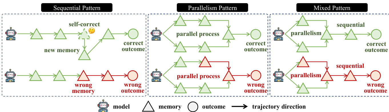 Any memory management strategy can be classified as an instance of either the sequential or parallelism pattern, or a composition of both, referred to as the mixed pattern. The mixed pattern combines both sequential and parallel processing steps, allowing for more complex and flexible memory management. The framework is designed to handle various processing scenarios, including self-correction and error propagation, as illustrated by the different trajectories in the diagram. The model's ability to manage memory effectively across these patterns is crucial for accurate outcome prediction.