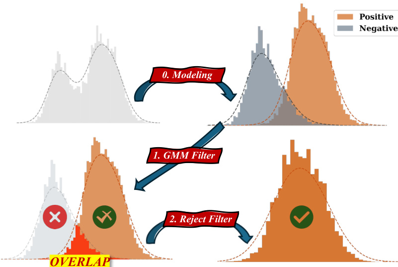 p(x)=π1N(x∣μ1,σ12)+π2N(x∣μ2,σ22)where π1 and π2 are mixing weights. The component with the higher mean is mapped to the positive distribution, while the lower mean corresponds to the negative distribution.