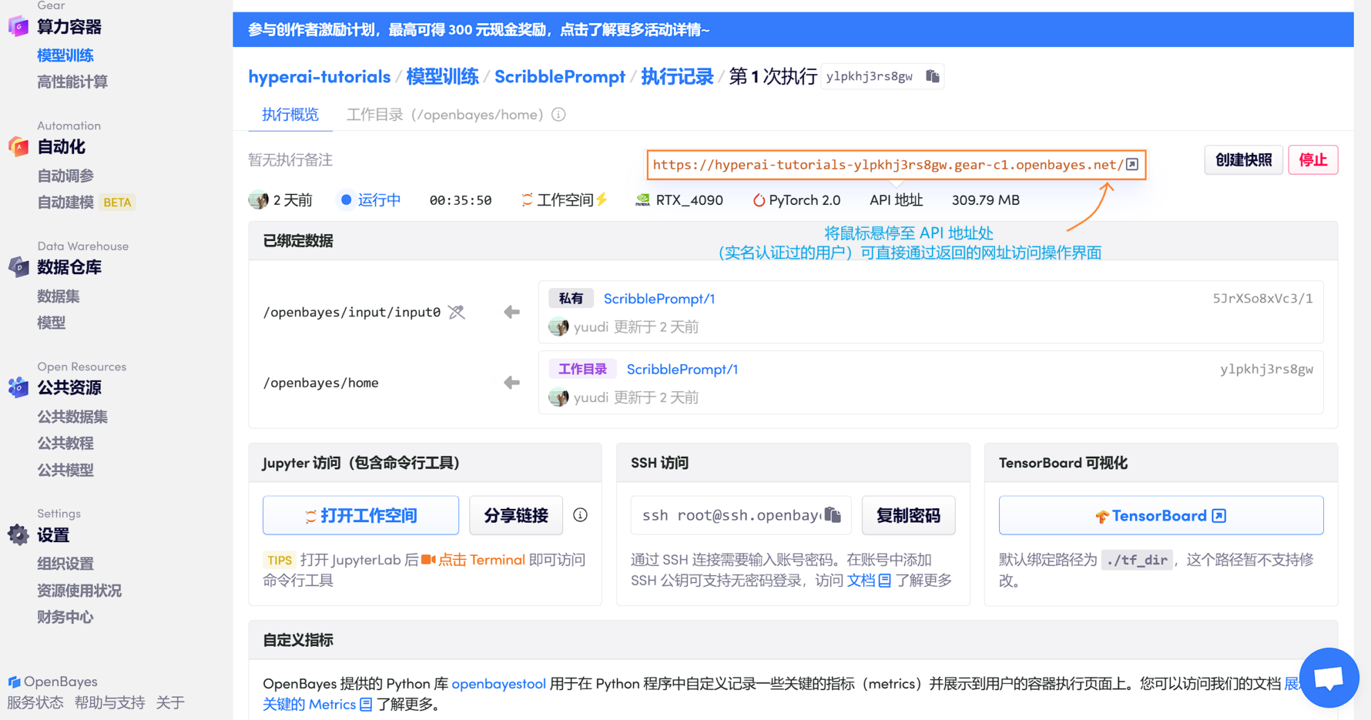 2. 等待容器资源分配完成后,可直接使用平台提供的 API 地址进行操作页面的访问(需要提前完成实名认证,此步无需打开工作空间)