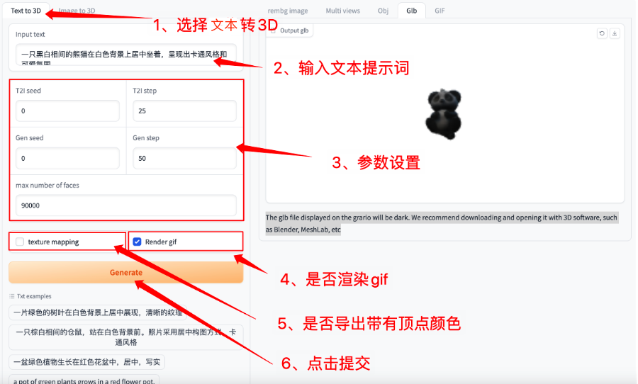 选择「Text to 3D」功能,按如下要求输入提示词和进行相关设置