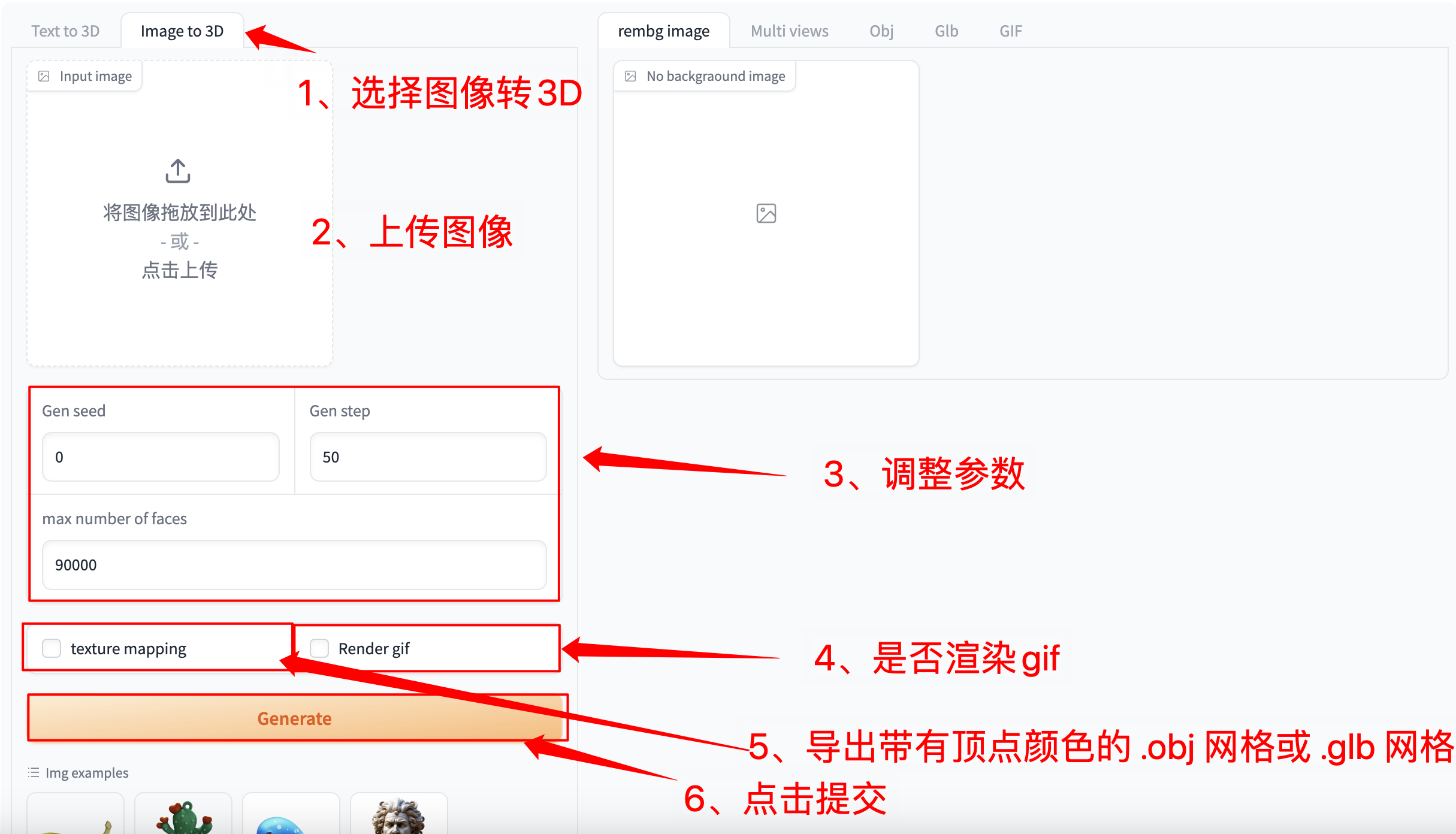 选择「Image to 3D」功能,按如下要求输入提示词和相关设置。