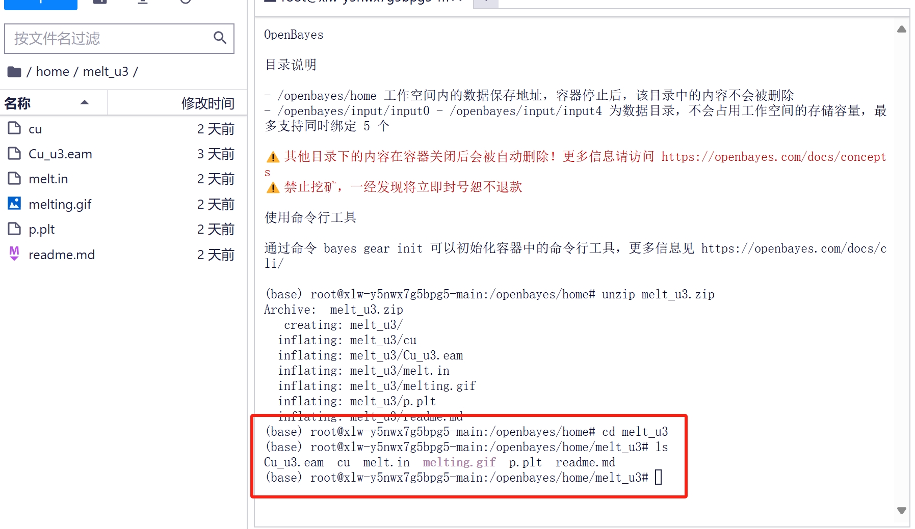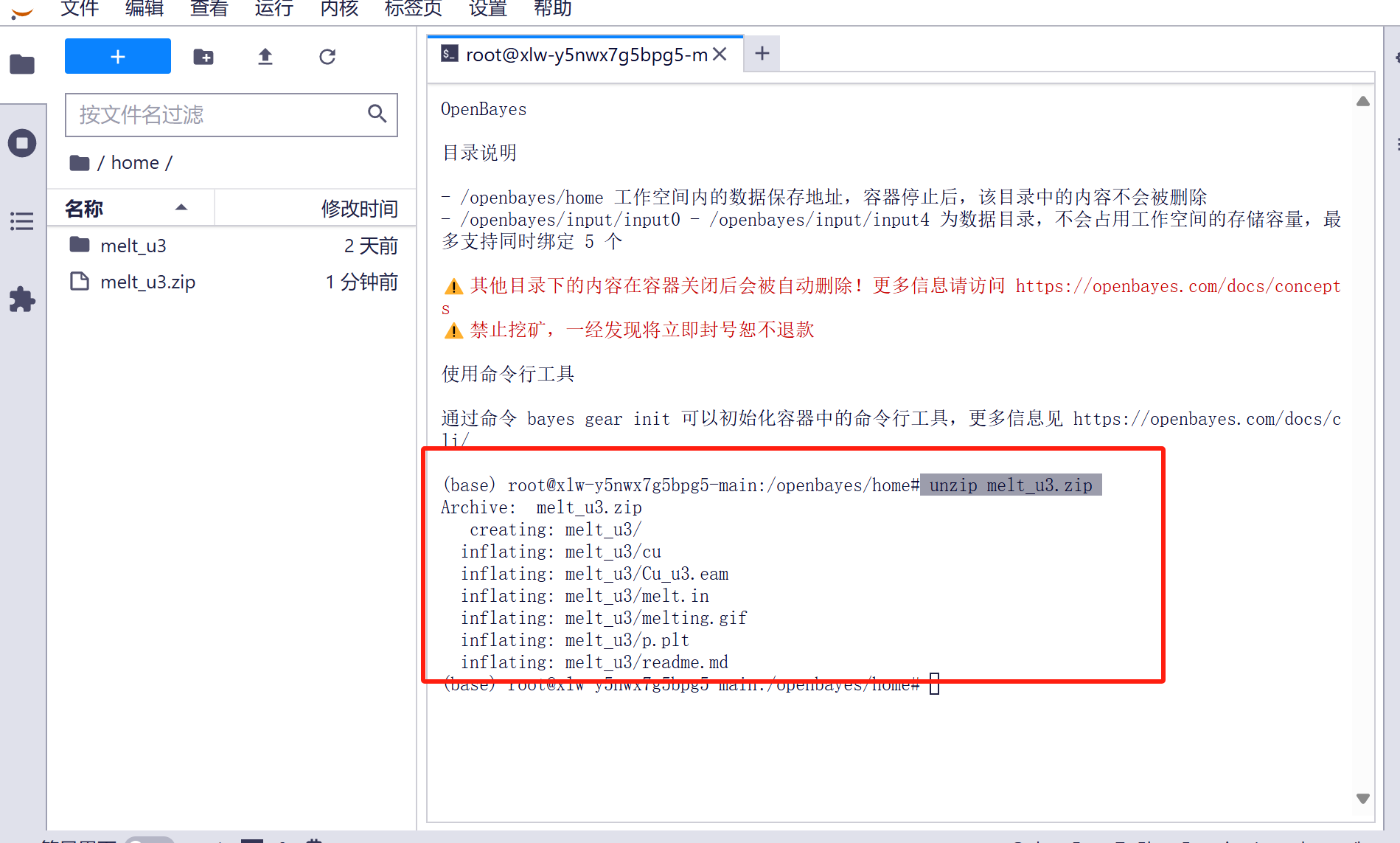 2.4 Unzip (the compressed package has been unzipped in this container, so you can skip this step): Enter unzip melt_u3.zip to unzip the compressed package
