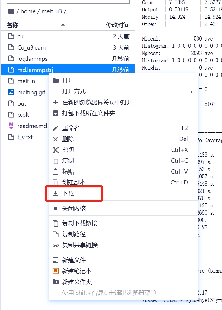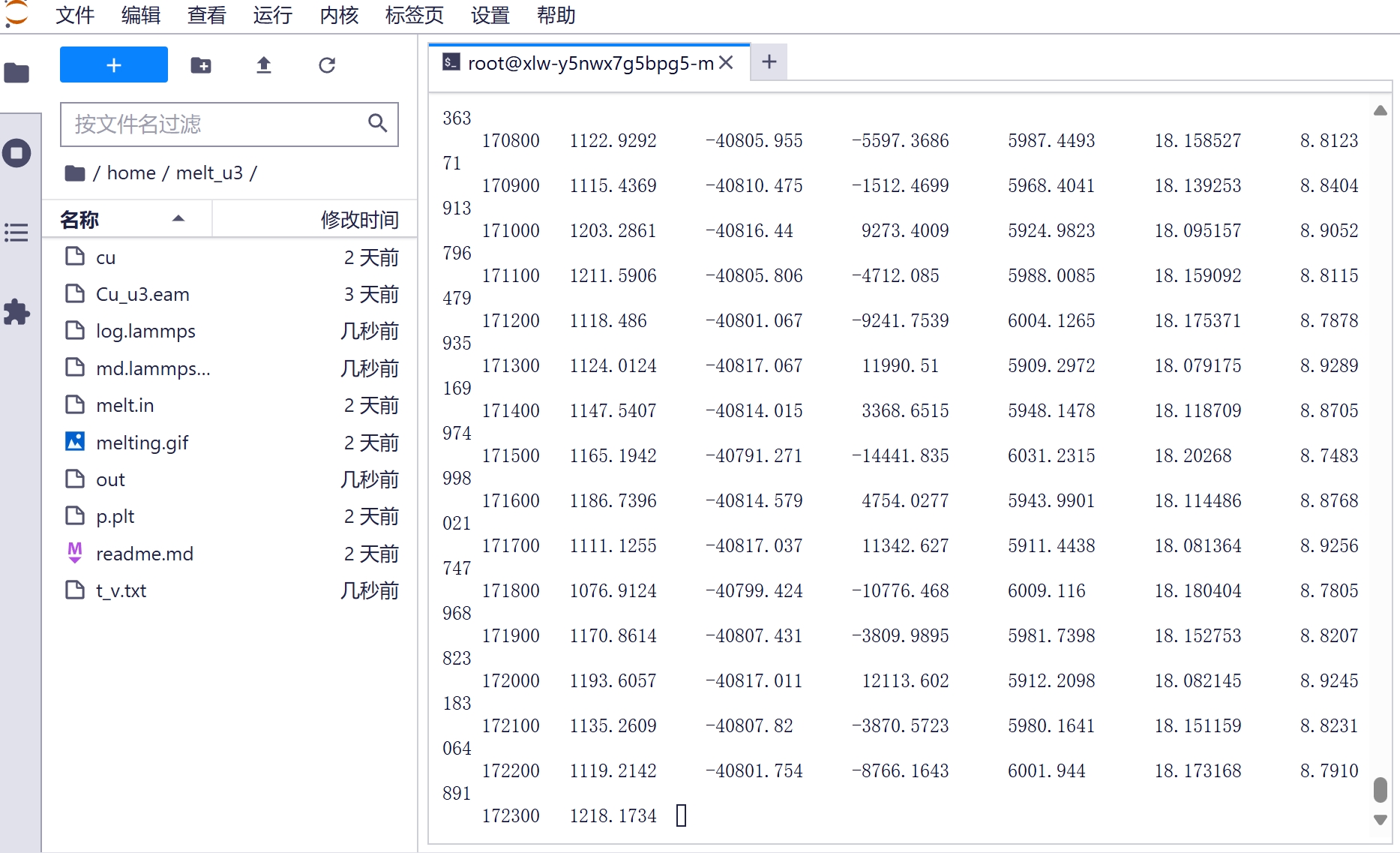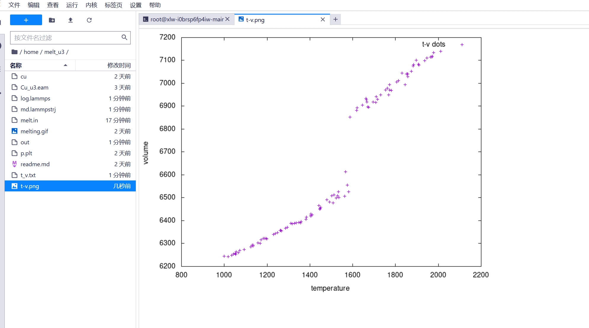 It can be seen that the melting point is around 1600K, which is different from the actual 1357.77K. This is because the temperature rises too quickly and the copper does not have time to melt.