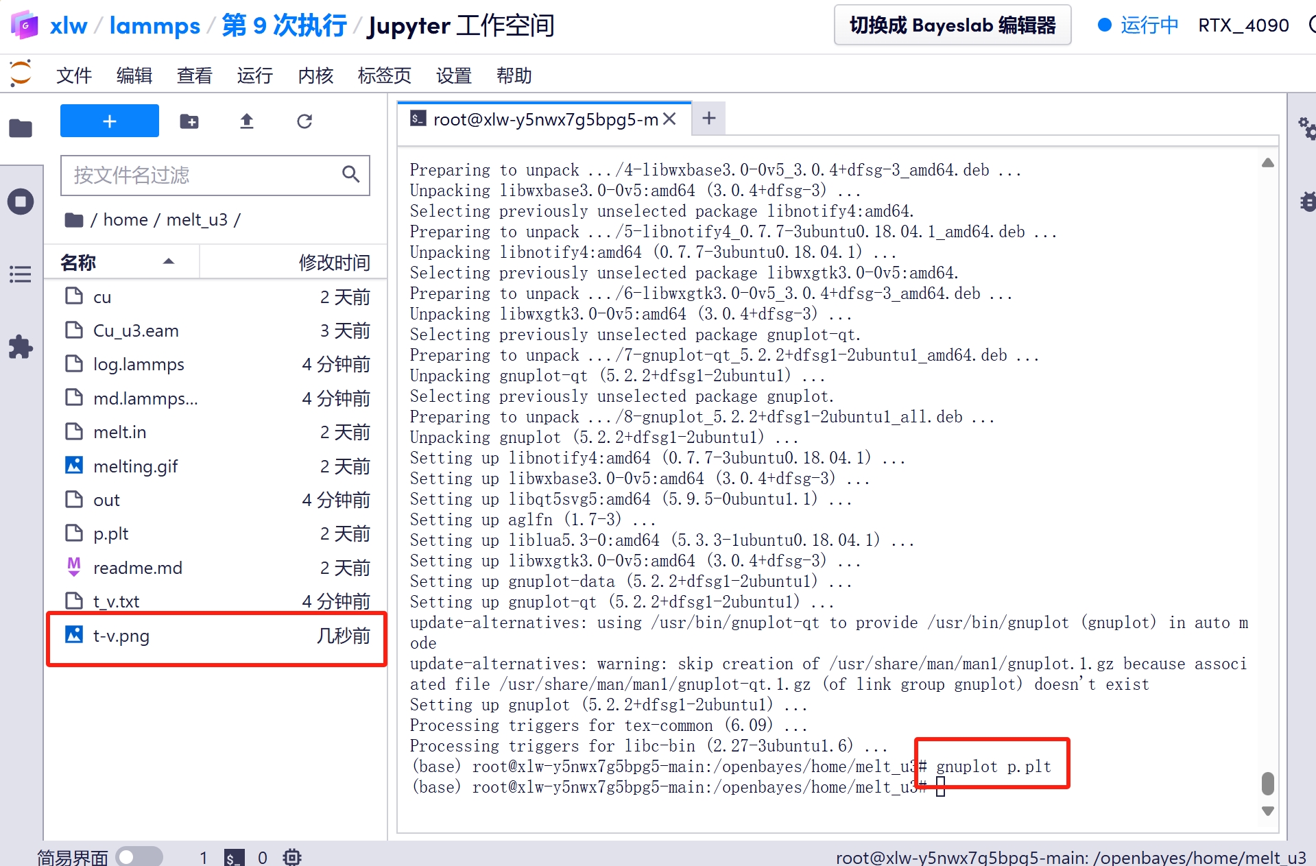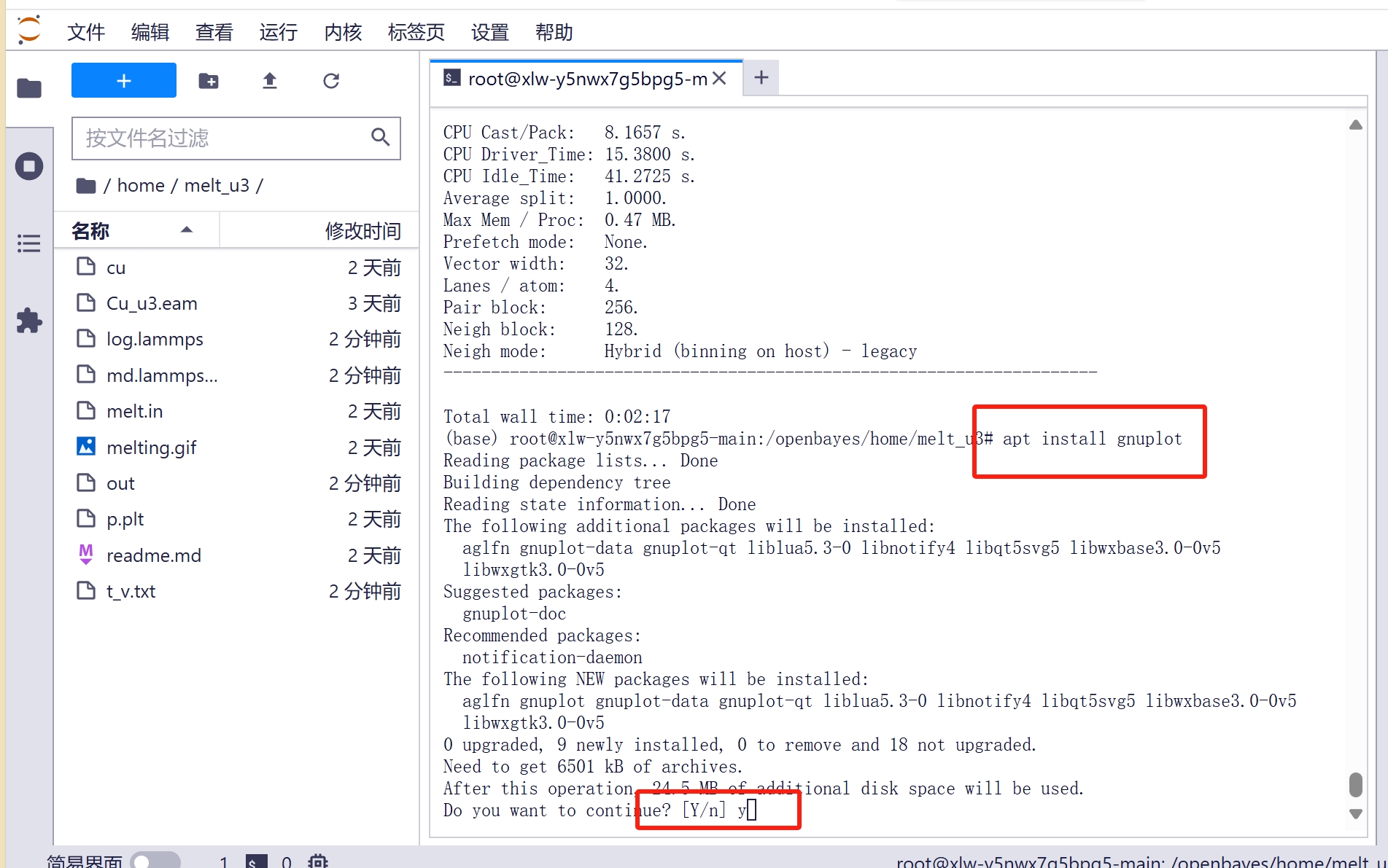 3.2 Type apt install gnuplot to install the gnuplot tool, and then type y and press Enter to confirm.
