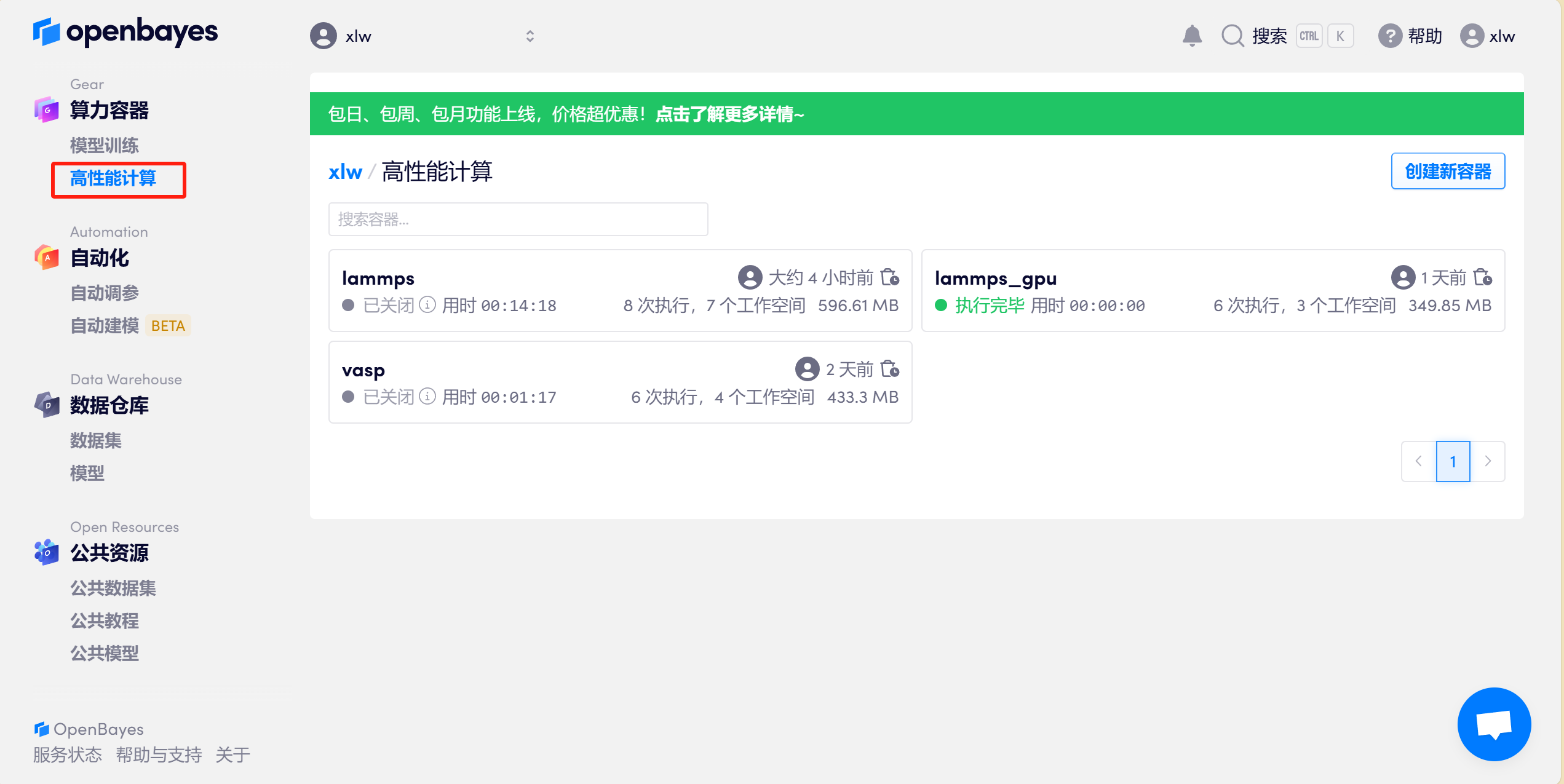 1.1 Open the OpenBayes personal user interface, click "High Performance Computing" on the left > "Create New Container" in the upper right corner