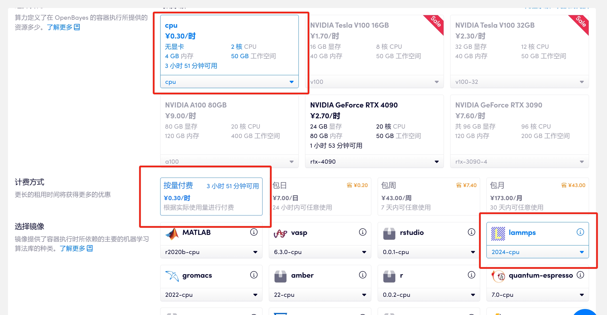 1.2 Computing power Select "CPU" > "lammps-2024-cpu" and give a container name, such as lammps > Select "Workspace" and click "Next: Select computing power"