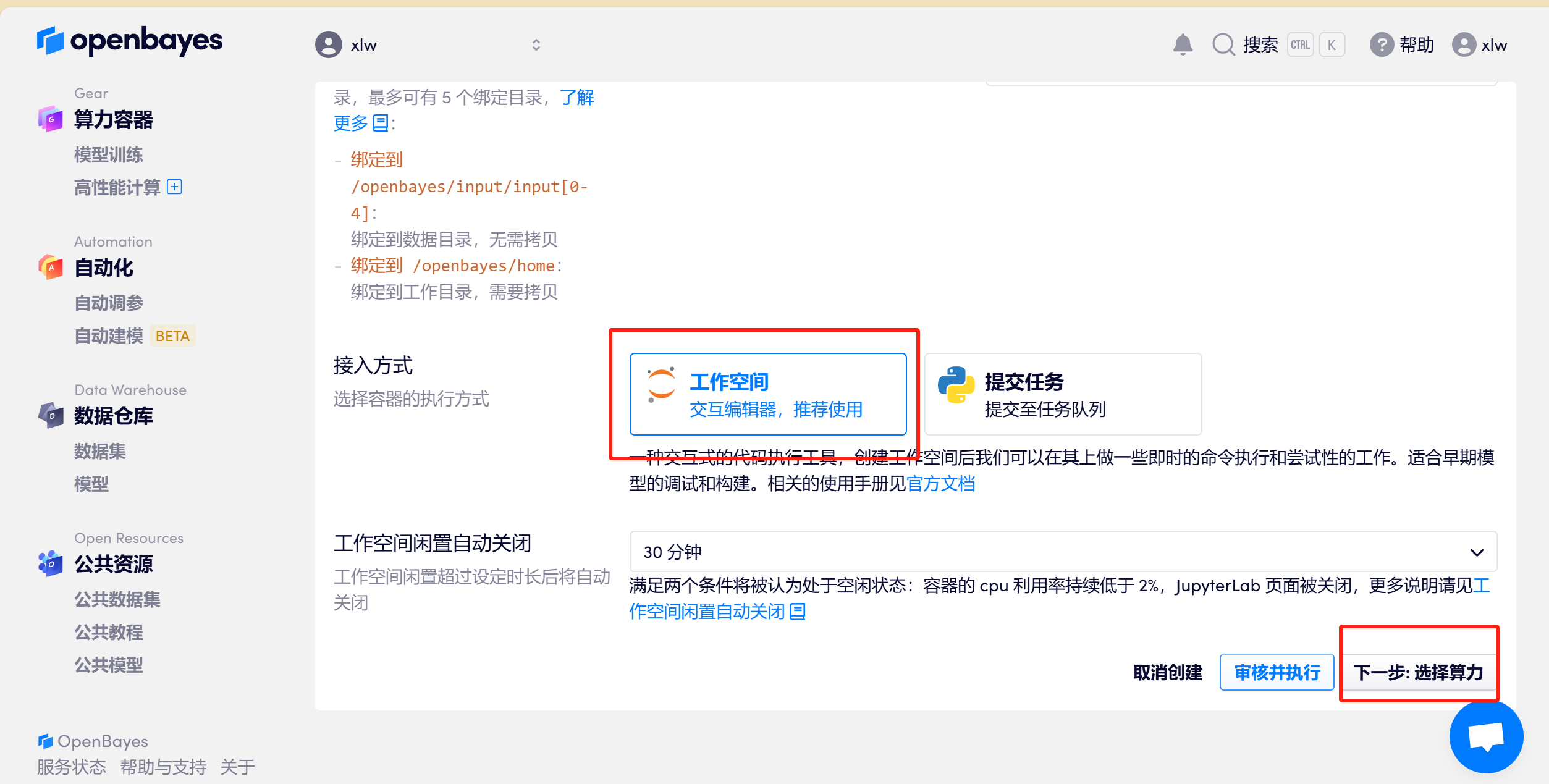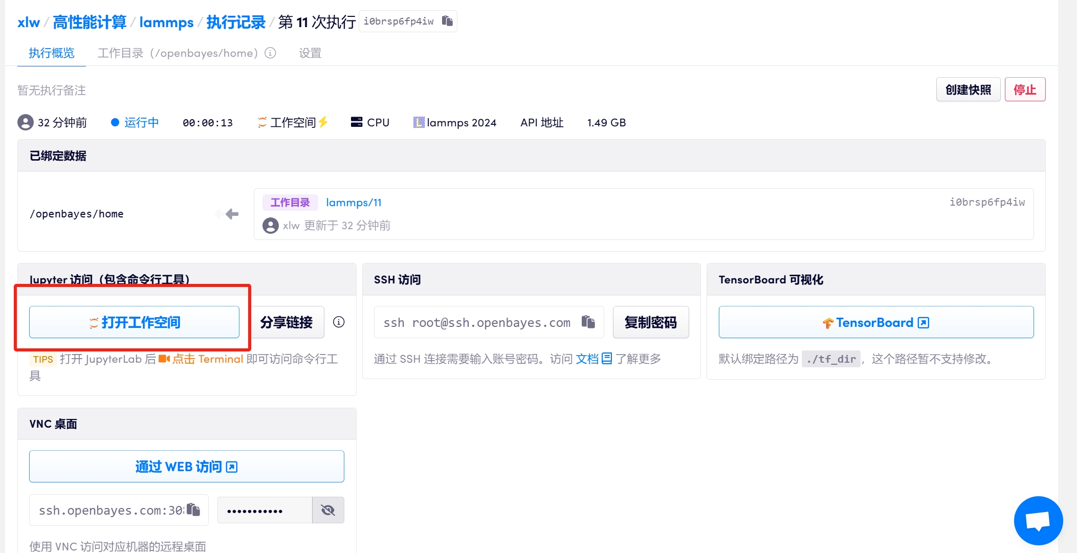 1.3 Give a container name, such as lammps > Select "Workspace" and click "Execute"