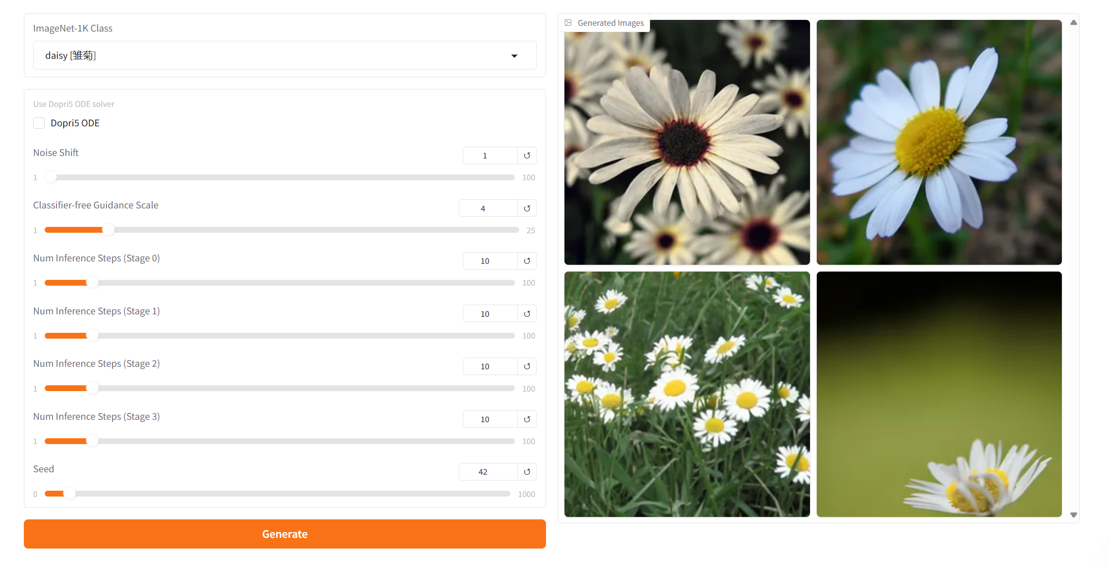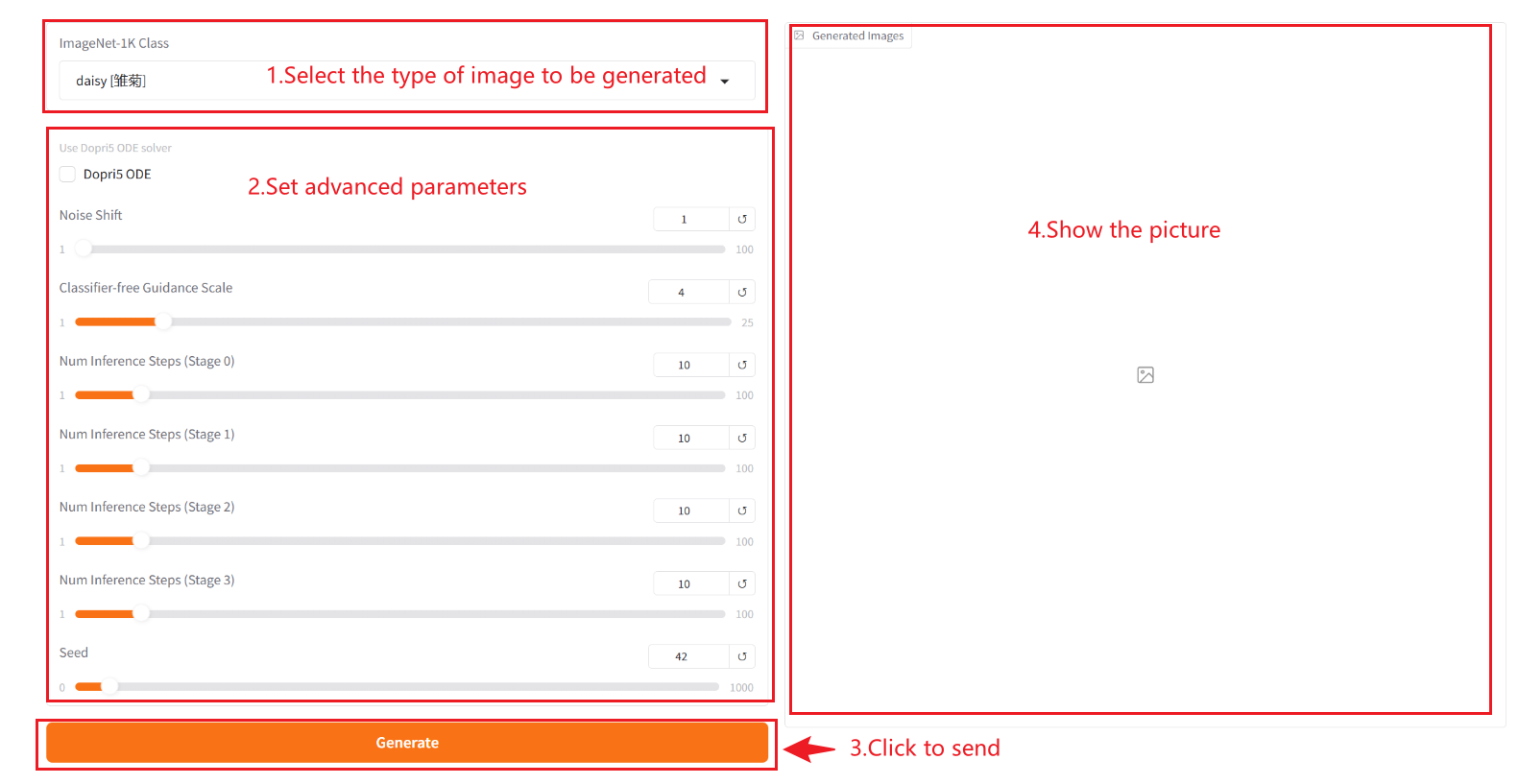 - ImageNet-1k Class: The generated images can only select the categories given in the drop-down box and cannot be customized.