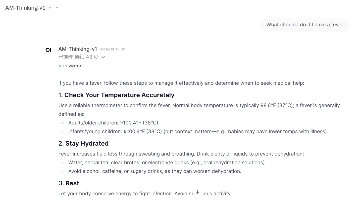 AM-Thinking-v1 is a 32 B dense language model developed by am-team on May 10, 2025, focusing on enhancing reasoning capabilities. The model shows strong performance in reasoning benchmarks, comparable to large MoE models such as DeepSeek-R1, Qwen3-235B-A22B, Seed1.5-Thinking, and larger dense models such as Nemotron-Ultra-253B-v1. The related paper results are "AM-Thinking-v1: Advancing the Frontier of Reasoning at 32B Scale".