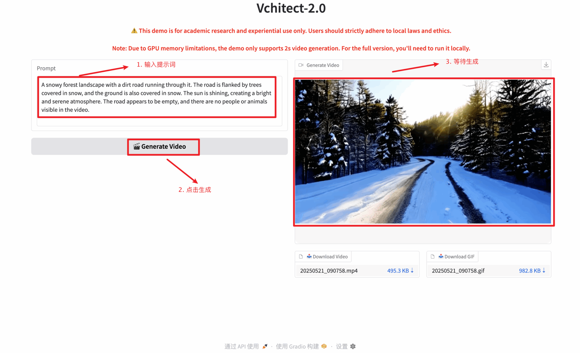 You need to enter a text prompt to generate a video. The text prompt only supports English. The text prompt can be of any length, but it is recommended to be within 100 characters, otherwise the generated video may be too long and affect the video quality. The video needs to wait for about 2-5 minutes, so please be patient.