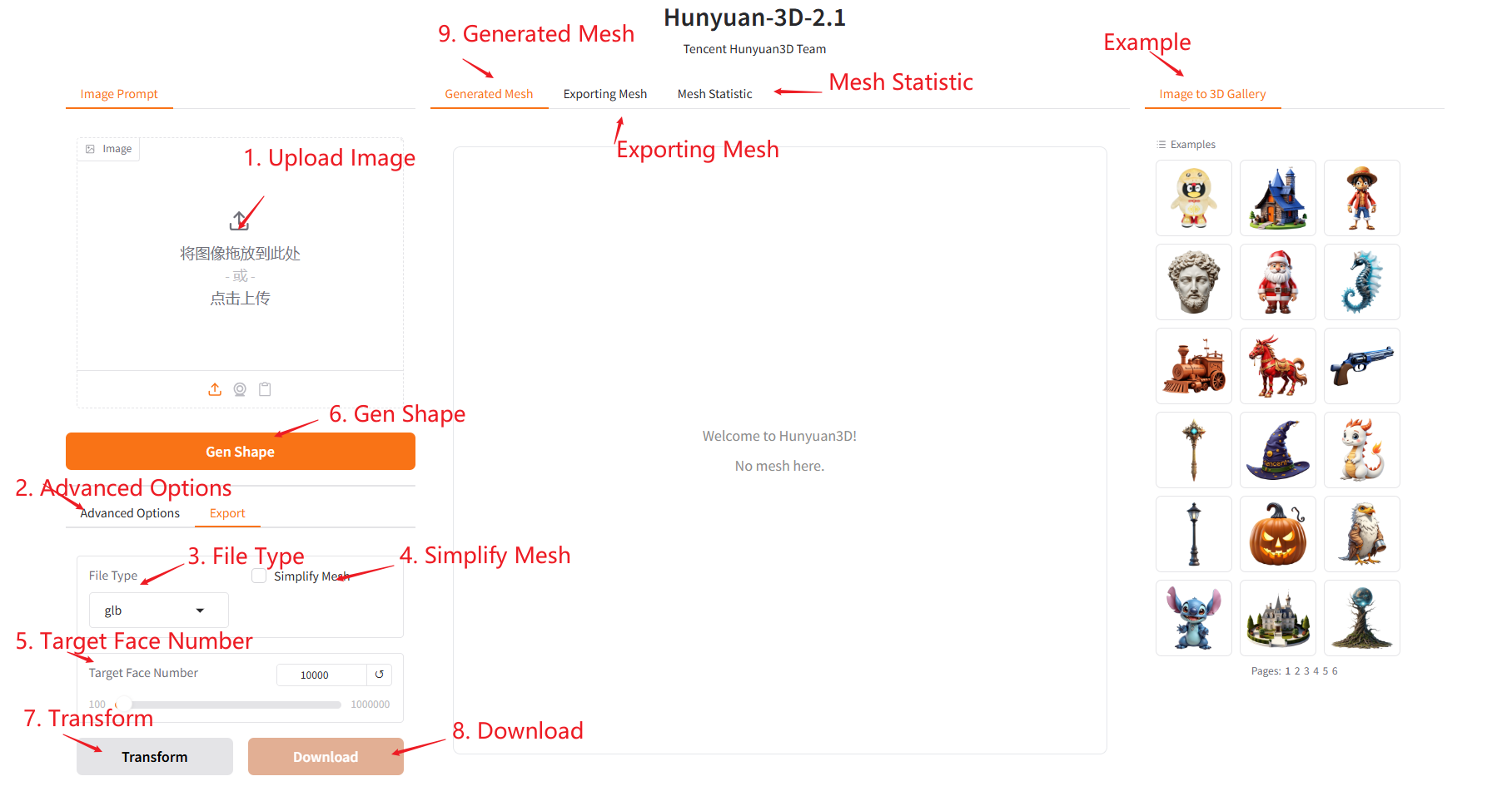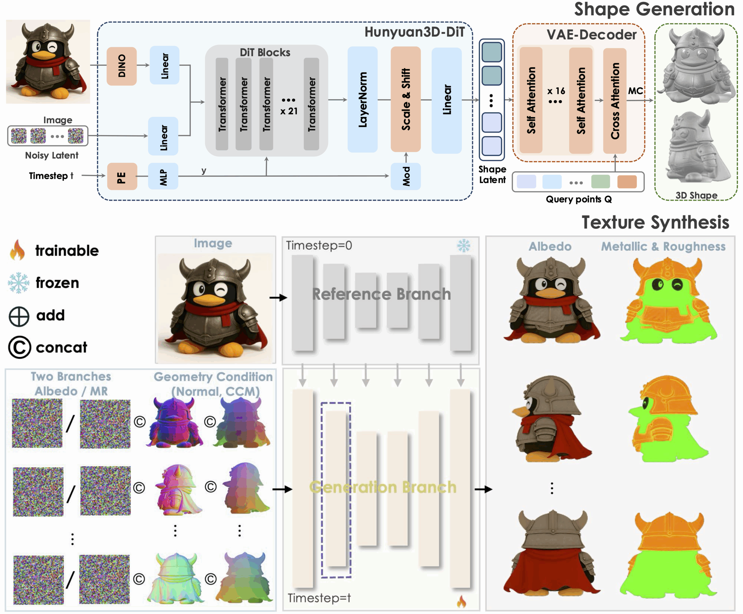 Tencent Hunyuan3D-2.1 is an industrial-grade open source 3D generation model released by the Tencent Hunyuan team on June 14, 2025. It is a scalable 3D asset creation system. It promotes the development of cutting-edge 3D generation technology through two key innovations: a fully open source framework and physically based rendering (PBR) texture synthesis. The first material generation model that supports physically based rendering, a complete material system based on physical laws such as diffuse reflection, metalness, normal maps, etc., to achieve movie-level light and shadow interaction for materials such as leather and bronze, and meet the production-level precision requirements of game assets, industrial design, etc. At the same time, the data processing, training inference code, model weights and architecture are fully open to support community developers to fine-tune downstream tasks, provide a reproducible baseline for academic research, and reduce the cost of repeated development for industrial implementation. The relevant paper results are "Hunyuan3D 2.0: Scaling Diffusion Models for High Resolution Textured 3D Assets Generation", has been accepted by CVPR 2025.