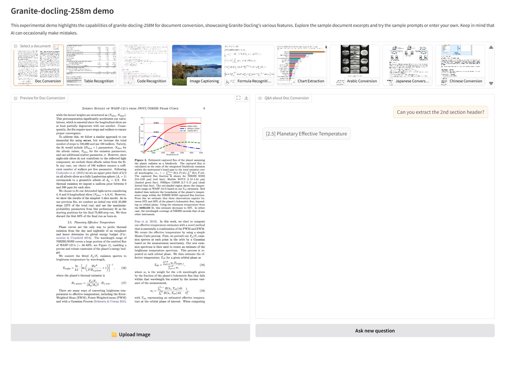 Granite-Docling-258M is a lightweight visual language model launched by IBM in September 2025, designed for efficient document conversion. The model can convert documents into machine-readable formats while fully preserving elements such as layouts, tables, and formulas. The model contains only 258M parameters, has excellent performance, is cost-effective, and supports multi-language processing (including Arabic, Chinese, and Japanese). The model uses the DocTags format to accurately describe the document structure to avoid information loss. Granite-Docling-258M can be seamlessly integrated with the Docling library, provides powerful customization and error handling capabilities, is suitable for enterprise-level document processing, and is a powerful tool in the field of document processing. The relevant paper results are "SmolDocling: An ultra-compact vision-language model for end-to-end multi-modal document conversion", the relevant blog is "IBM Granite-Docling: End-to-end document understanding with one tiny model".