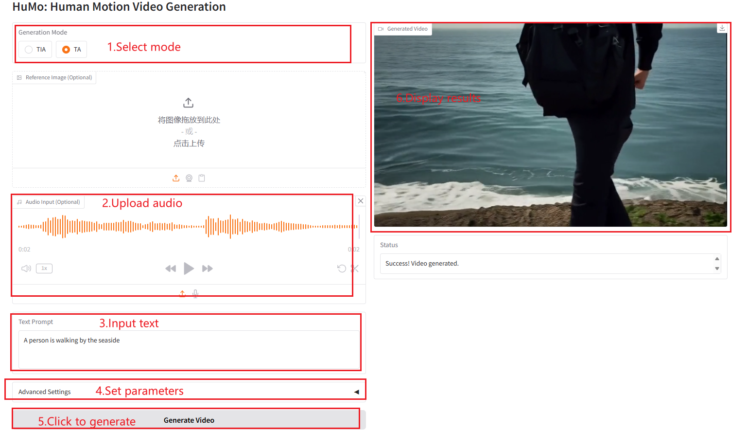 - Sampling Steps: The number of sampling steps used to control the quality and details of the generated video.