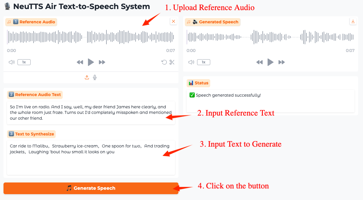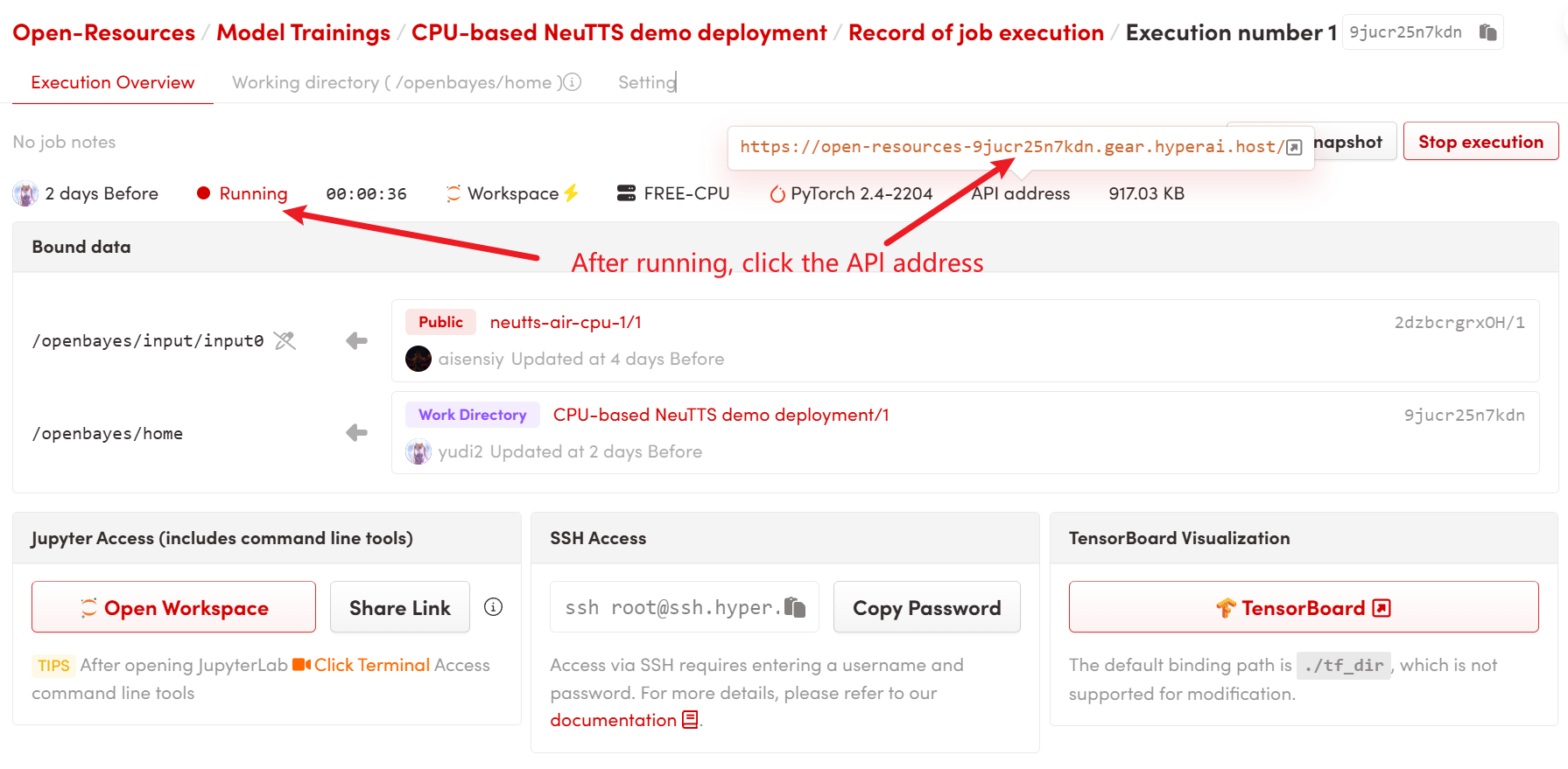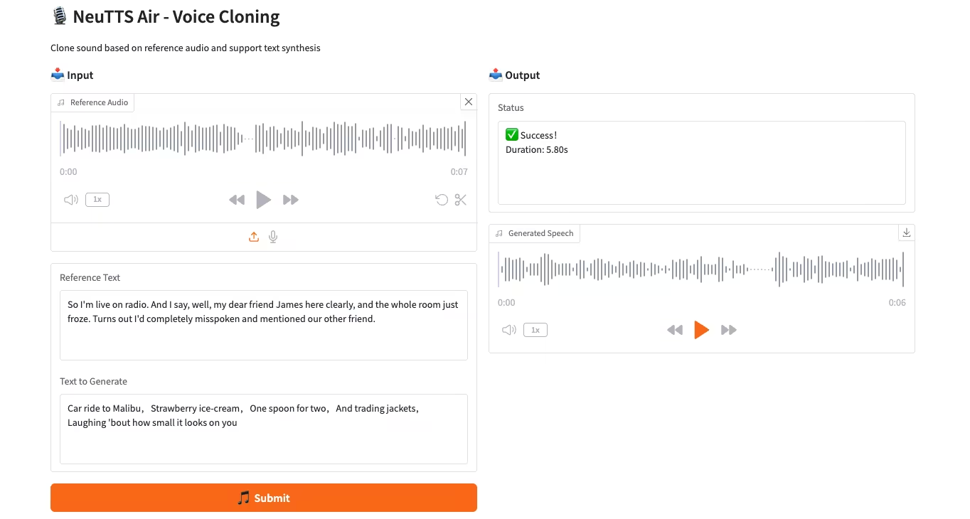 This tutorial uses CPU resources, the model only supports English, and it takes more than half a minute to synthesize a voice. If you want to experience faster processing speed, you can use a single card RTX 5090 Clone TutorialNeuTTS-Air: A lightweight and efficient voice cloning model".