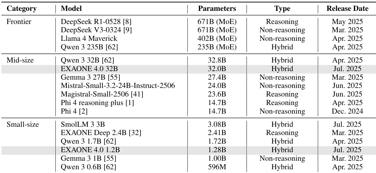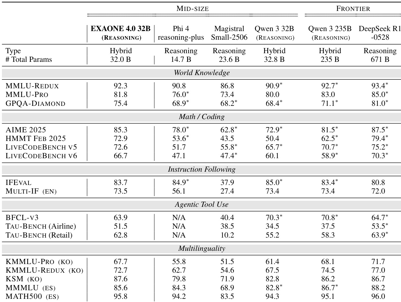 - EXAONE 4.0 achieves superior performance among open-weight models of similar scale and remains competitive with frontier models, particularly in mathematical reasoning, coding, and expert knowledge tasks, with both 32B and 1.2B variants publicly available for research.