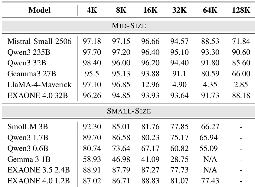 The EXAONE 4.0 model series includes two configurations: a 32B parameter model and a 1.2B parameter model. Both models share the same vocabulary, which consists of Korean and English tokens in roughly equal proportions, along with a small number of multilingual tokens. The maximum context length for the 32B model is extended to 128K tokens through a two-stage process. Initially, a model pretrained with a 4K context length is extended to 32K tokens, and then further extended to 128K tokens. This process is validated at each stage using the Needle In A Haystack (NIAH) test to ensure the model's performance is maintained. For the 1.2B model, the context length is extended to 64K tokens, which is approximately twice the typical maximum length supported by most models in the 1B-parameter range.
