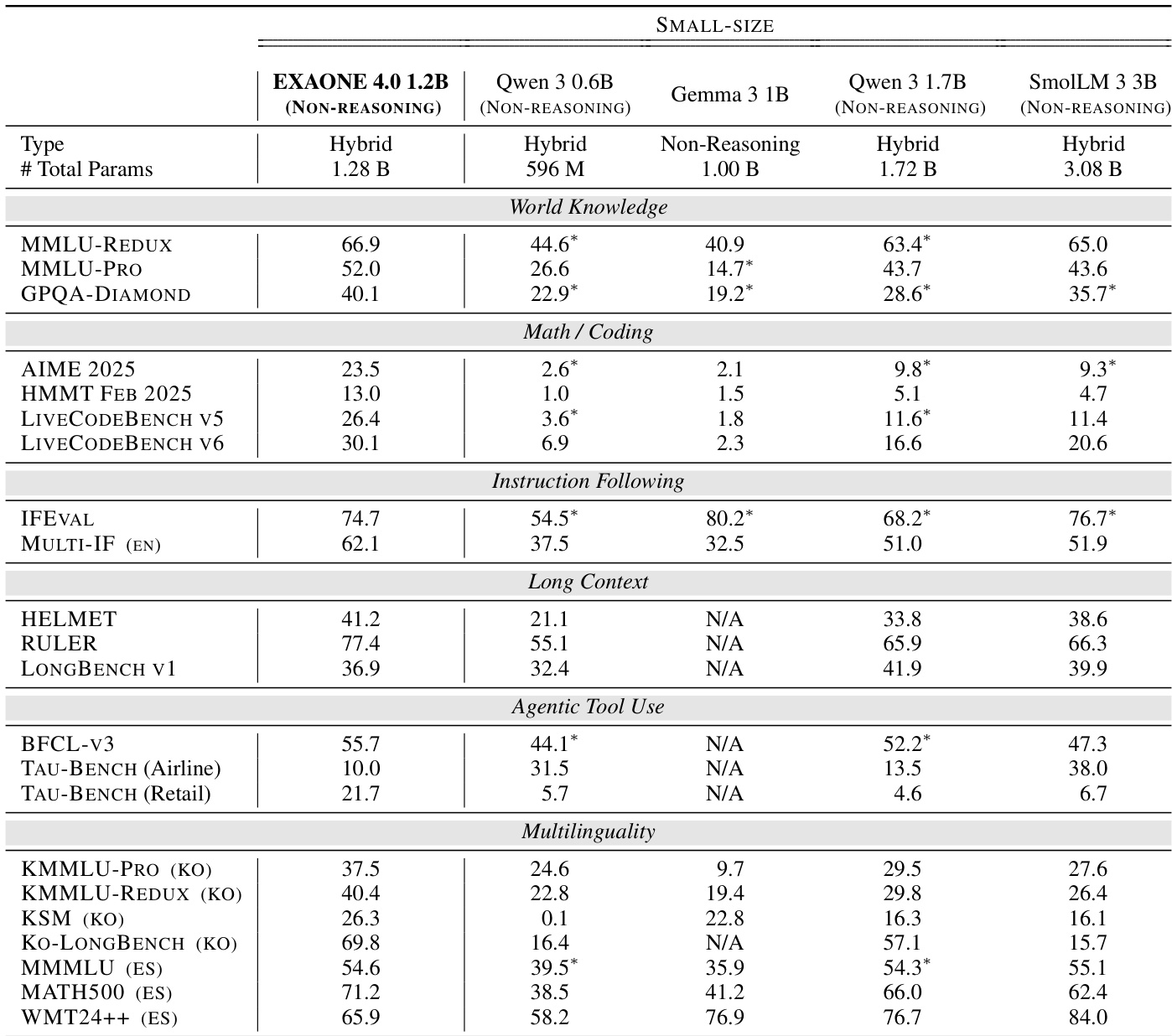 The authors use the table to compare the performance of EXAONE 4.0 1.2B in NON-REASONING mode against several small-size models across multiple benchmarks. Results show that EXAONE 4.0 1.2B achieves competitive results in most categories, particularly excelling in Math/Coding and multilingual tasks, while demonstrating strong performance in long-context and instruction-following benchmarks compared to other models.