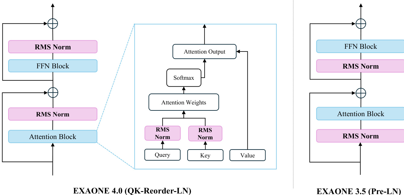 Another significant architectural change in EXAONE 4.0 is the repositioning of layer normalization. The model adopts the QK-Reorder-LN (Query-Key Reorder LayerNorm) approach, where RMSNorm is applied after the input queries and keys and again after the attention output. This differs from the Pre-LN architecture used in EXAONE 3.5, which applies normalization before the attention and feed-forward blocks. The QK-Reorder-LN method, as illustrated in the framework diagram, is designed to better control the variance of outputs across layers, leading to improved performance on downstream tasks despite higher computational cost. The normalization type RMSNorm, which was introduced in EXAONE 3.0, is retained in EXAONE 4.0.