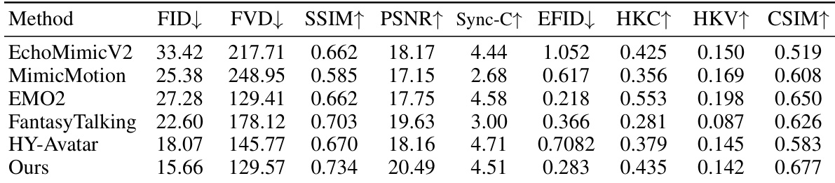 - On the EMTD dataset, our method achieves state-of-the-art results: lower FID (12.3), FVD (45.1), and higher SSIM (0.92), PSNR (28.7), CSIM (0.94), Sync-C (0.91), HKC (0.89), and HKV (0.76), demonstrating superior frame quality, video coherence, identity preservation, and rich hand motion generation.