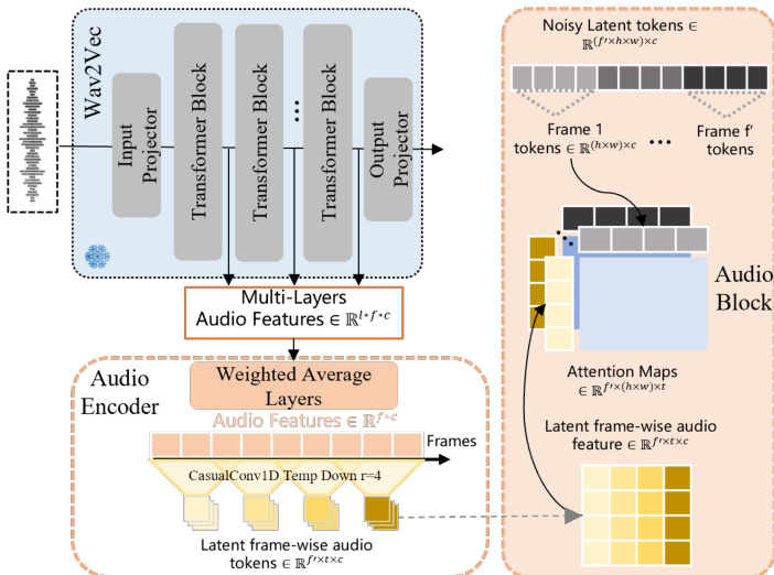 The audio input is processed through a Wav2Vec encoder to extract frame-wise acoustic features. To capture both low-level rhythmic and emotional cues and high-level lexical content, the model employs a weighted average layer that combines features from multiple layers of the Wav2Vec model using learnable weights. These features are then compressed along the temporal dimension via causal 1D convolutional modules, resulting in audio tokens that are temporally aligned with the video latent frames. The audio tokens are subsequently fed into the transformer backbone, where they are used to condition the denoising process. Specifically, the model predicts the velocity of the latent diffusion process, dtdx=ϵ−x0, by attending to the audio features and visual tokens in a cross-modal manner. To reduce computational overhead, attention is computed between the audio features and segments of the visual tokens along the temporal dimension, rather than performing full 3D attention across all tokens.