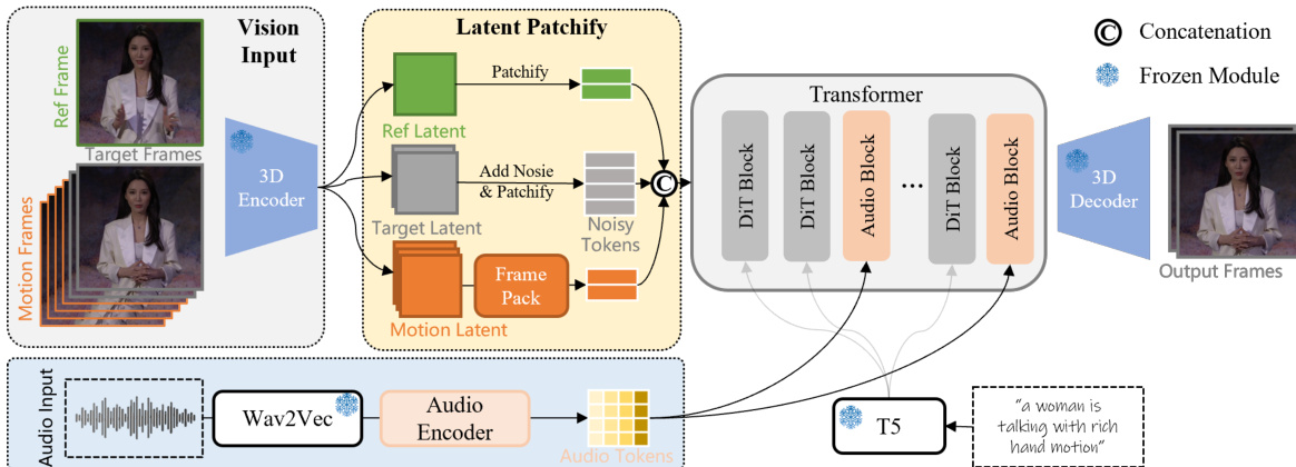The authors leverage a diffusion-based framework for audio-driven video generation, where the model learns to denoise latent representations of video frames conditioned on audio input, a reference image, and a textual prompt. The overall architecture operates on a sequence of noisy latent tokens derived from the target video frames, which are progressively refined to produce coherent and audio-synchronized output. As shown in the figure below, the framework begins with a 3D Variational Autoencoder (VAE) that encodes the input video frames into a lower-dimensional latent space, enabling efficient processing. The reference image, target frames, and optional motion frames are all encoded into latent representations, which are then patchified and flattened into a sequence of visual tokens. The motion frames, when provided, serve as a continuity condition, ensuring temporal consistency in the generated video. To manage computational complexity during long video generation, the motion latent is further compressed using a Frame Pack module, which applies higher compression to earlier frames, thereby reducing the memory footprint while preserving historical context.
